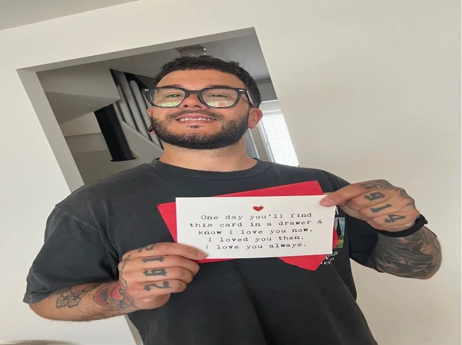 Alt Text: The ever-suffering husband standing in a doorway, smiling while holding a red envelope and a white card that reads: “One day you'll find this card in a drawer & know I love you now, I loved you then, I love you always.” His tattooed fingers are visible, and he’s wearing glasses and a black t-shirt.